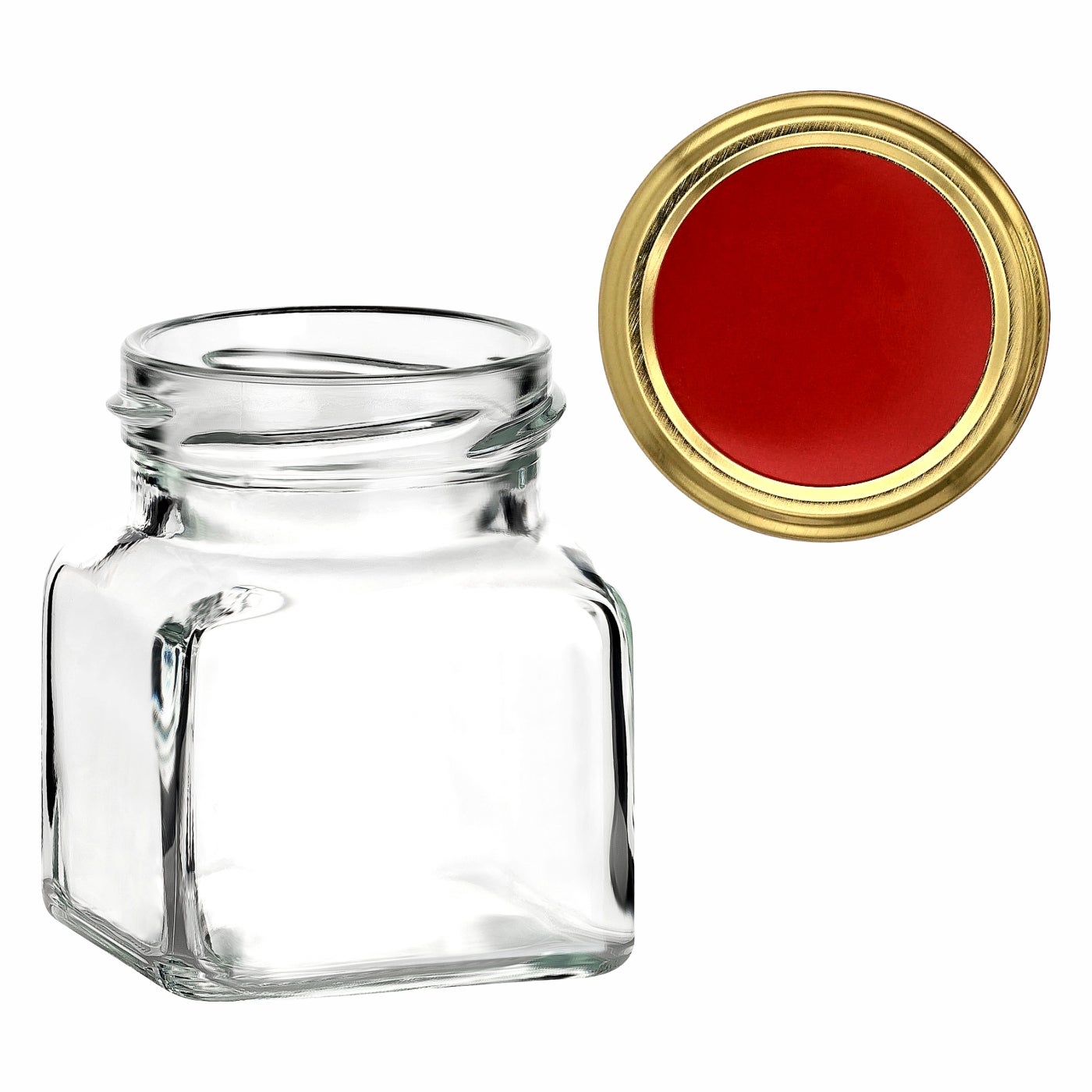 Produktinformationen "120 ml Einmachglas Eckig mit Verschluss Rot/Gold"