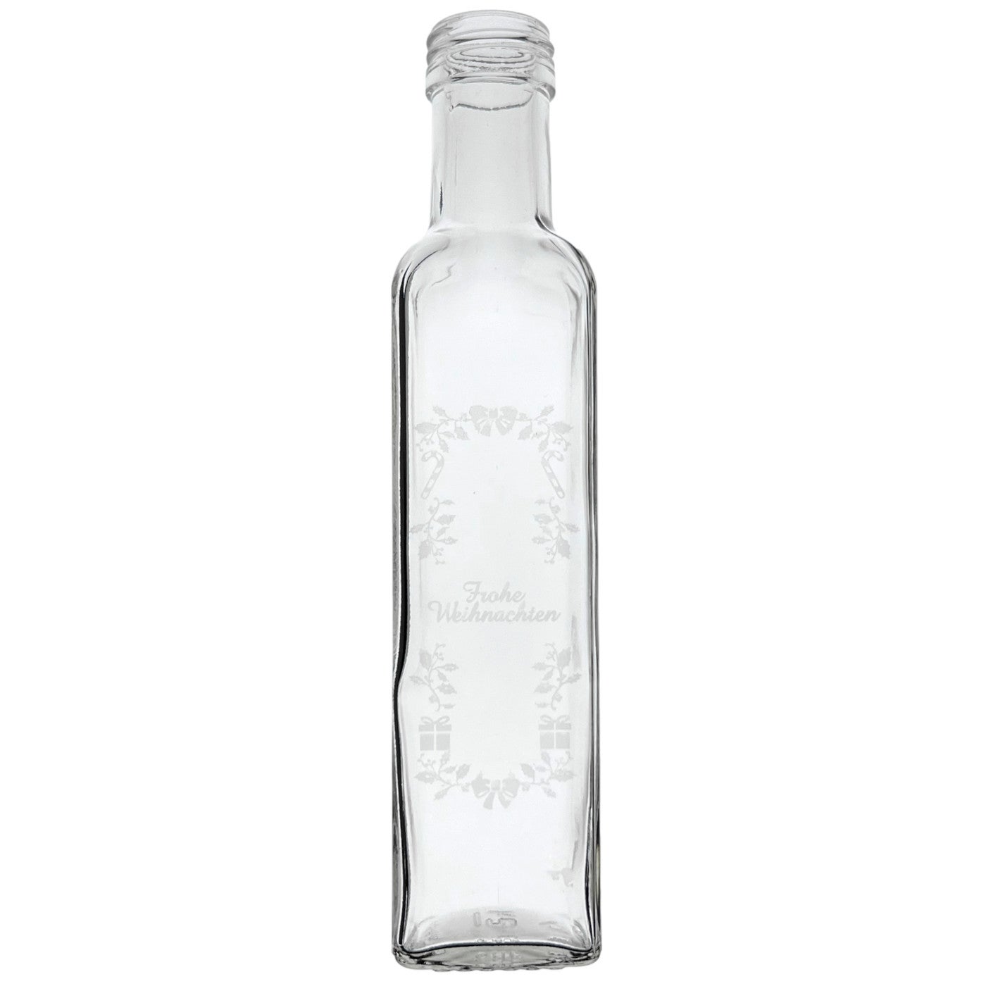 Jede Flasche wird mit einem sorgfältig lasergravierten "Frohe Weihnachten"-Motiv veredelt, das in der Reflexion des Lichts besonders bei dunklen Flüssigkeiten einen festlichen Glanz entfaltet. Wählen Sie eine dunkle Füllung, um das kunstvolle Design optimal zur Geltung zu bringen, während bei hellen Spirituosen die Gravur einen subtilen, eleganten Touch verleiht. Die Beständigkeit unserer Lasergravur gewährleistet, dass die weihnachtliche Botschaft auch nach wiederholtem Gebrauch nicht verblasst.